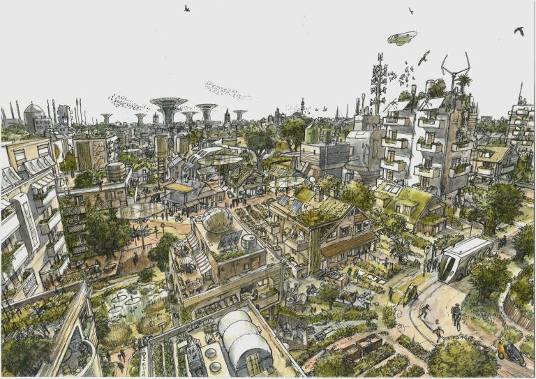 It all looks impossible, but with imagination, “things that currently look like intractable problems are actually huge opportunities for new thinking.” James McKay, an artist who draws what a low carbon future would look like, suggests “Find a place you pass every day, sit down and imagine it in the future, a future in which things turn out OK.”