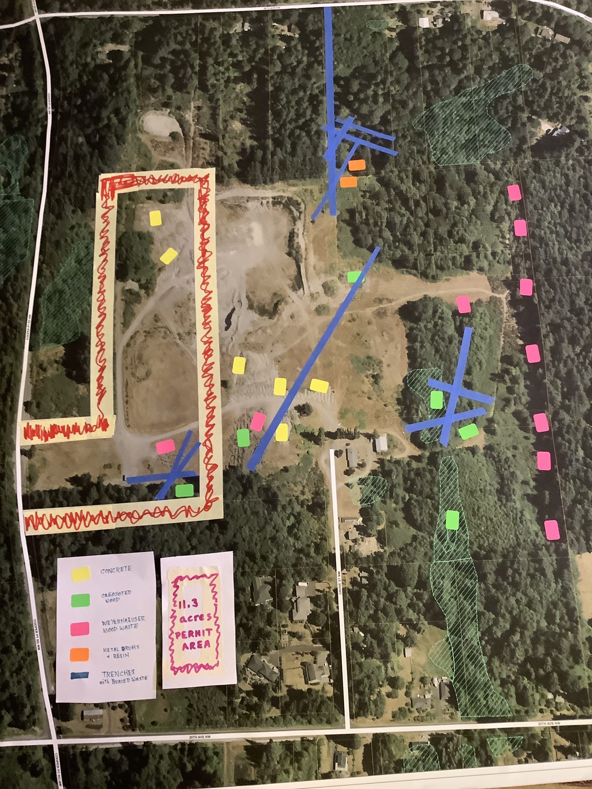 Roger meticulously mapped the areas where he found various kinds of debris – old rusted barrels with unknown contents, diesel fuels, household garbage, asbestos, concrete and other construction debris that was buried in different areas of the property. It was this map, documented with photos Roger took over the years, that finally convinced the Department of Ecology to list the site as a hazardous waste dump in July 2020, and begin the process of cleaning it up.