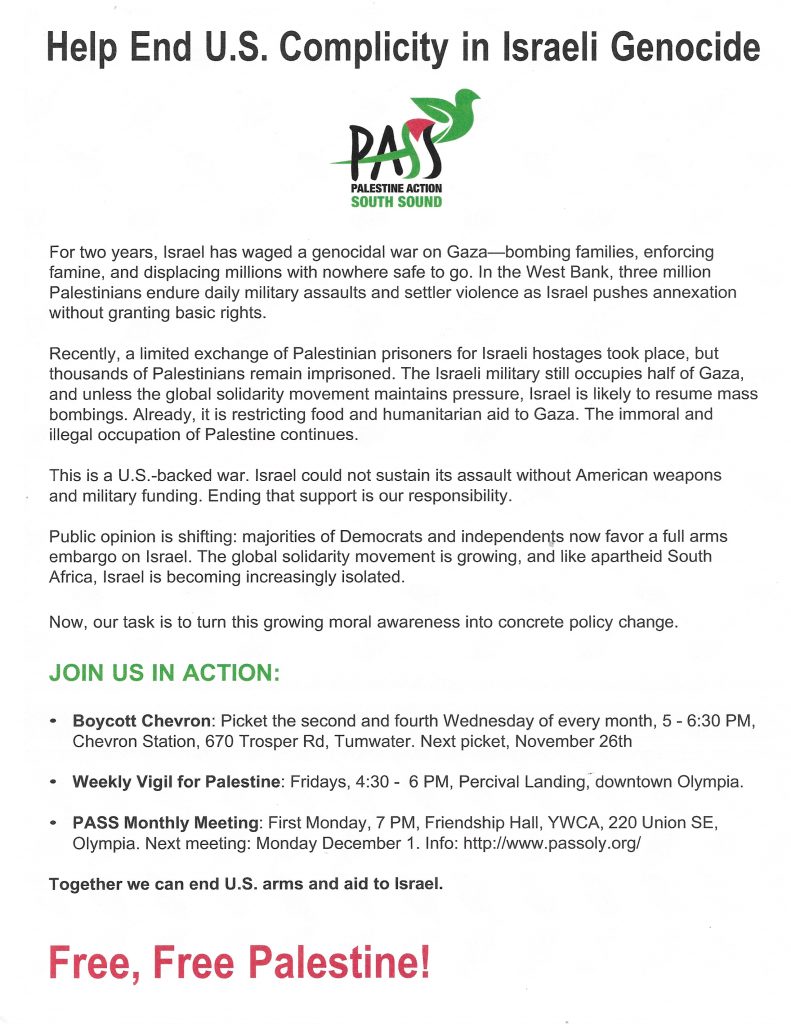 Palestine Action South Sound – Help End U.S. Complicity in Israeli Genocide PASS on November 30, 2025