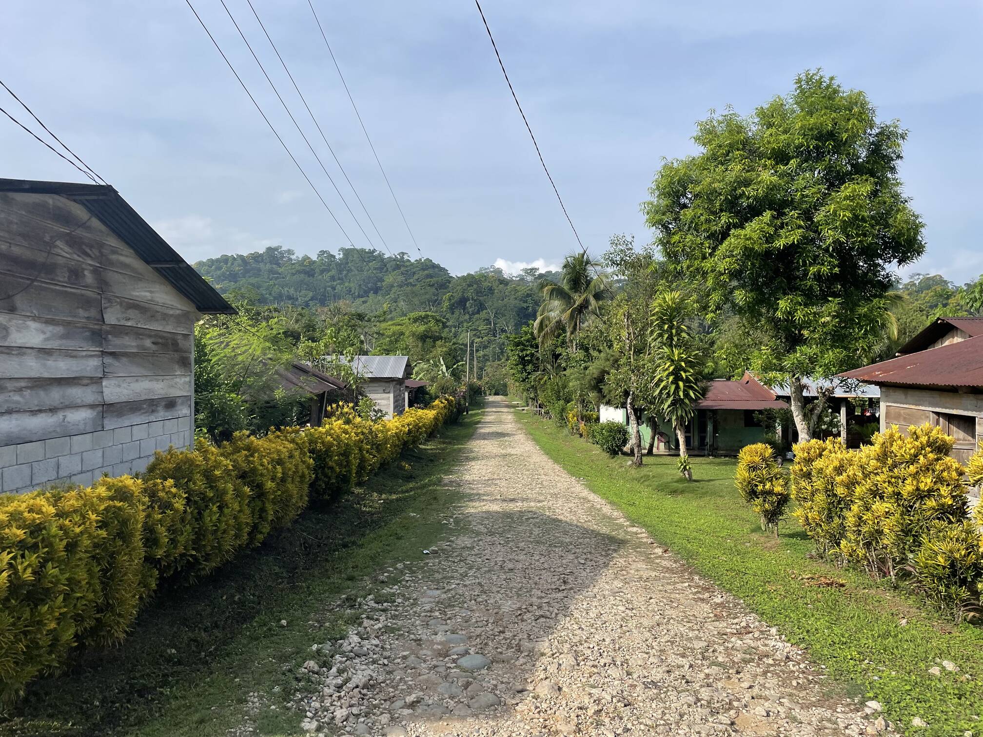 A typical street in Copal AA; rocky streets, buildings made from concrete blocks, locally-milled wood and sheet metal roofs. Electrical lines provide intermittent power.