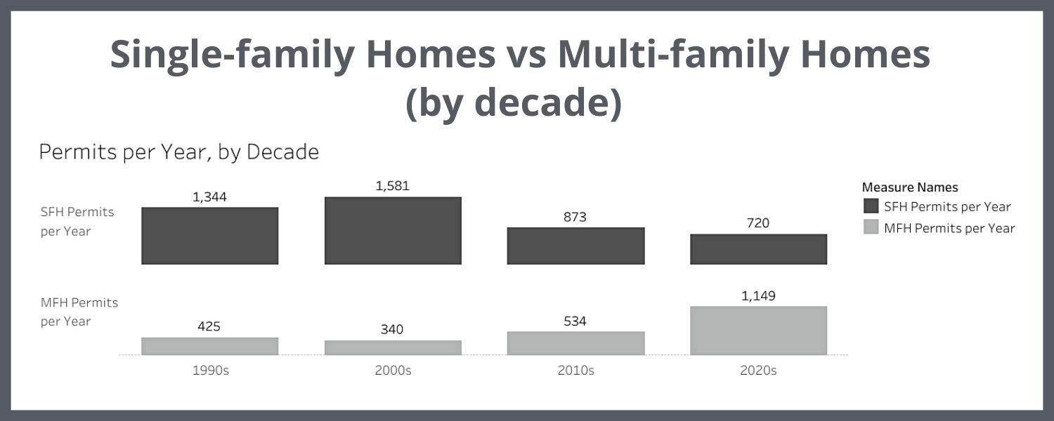 In 2020, the City amended its municipal code to add multifamily structures—duplexes, triplexes and fourplexes—to existing residential zones. These are expected to be rentals, not for sale to people looking to own a home. These same amendments removed a requirement that the owner of a residential lot with an Accessory Dwelling Unit occupy the premises. This makes it possible for an investor to offer two rentals where previously, one was required to be owner–occupied.