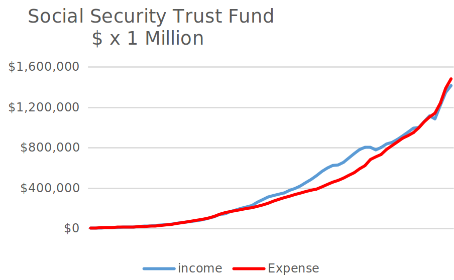 Heres the status of the Social Security Trust Fund today. There is a balance, of about two years of benefits. But because income is now lower than expense, that will be depleted very quickly.