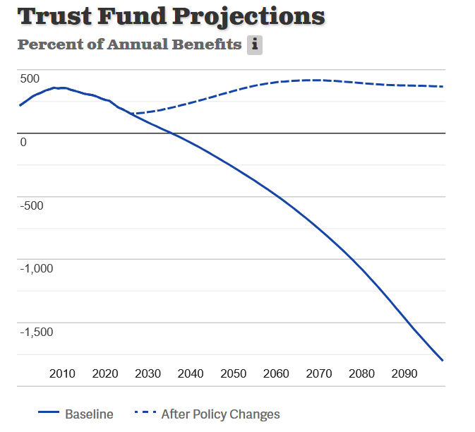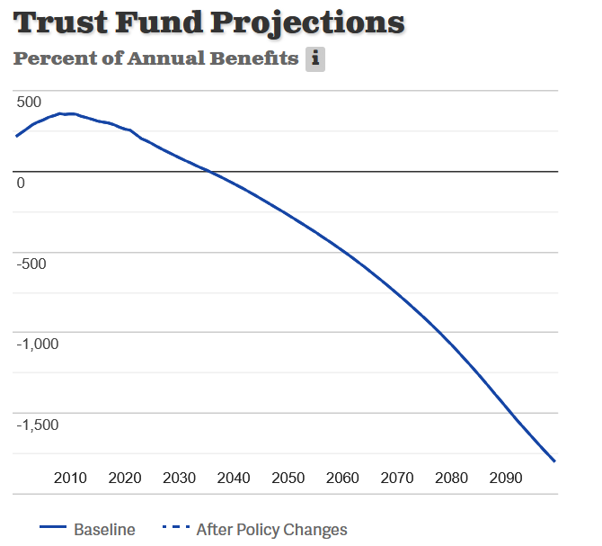 I fear that we are on a firm collision course with the exhaustion of the Social Security Trust Fund, and the cliffof benefits. I dont expect solutions before 2029, and by then, the Trust Fund will be approaching zero. Then they will have to be fairly drastic solutions. I expect a mix of revenue increases, benefit cuts, and deficit spending will keep existing benefits to existing beneficiaries. These will slow the growth of benefits, impose some higher contributions on richer taxpayers, and there will probably be some federal borrowing to keep Social Security afloat. Put another way, the Congress will use a lot of duct tape to keep Social Security from falling apart. And thats if things go well.
