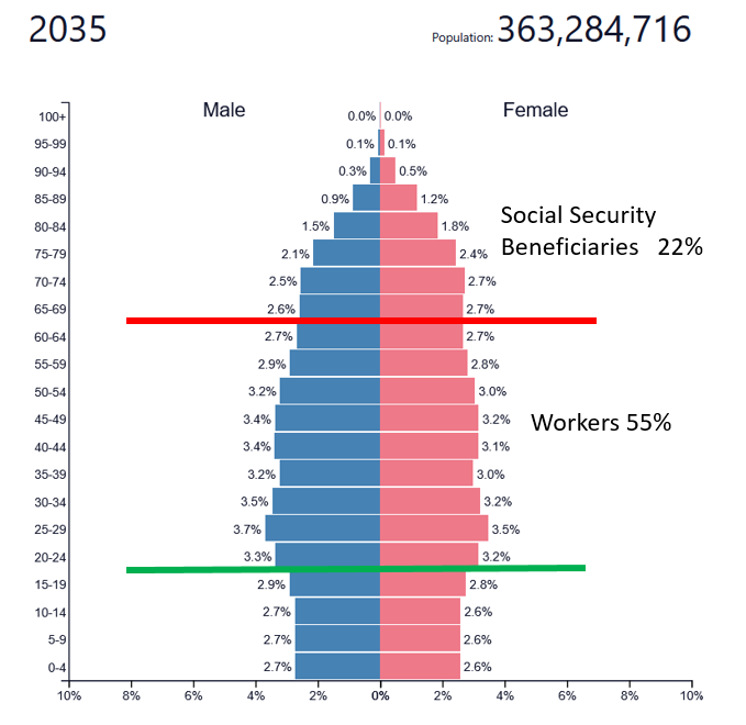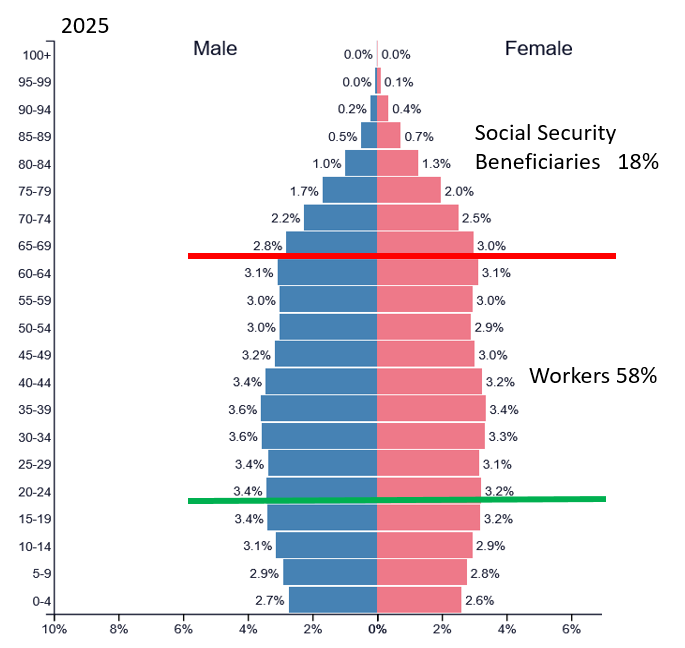 More than anything else, these problems are caused by the aging of the US population. This is not unique to the US Japan, Korea, China, and most of Western Europe are also aging. The population pyramid” shows how this is happening.