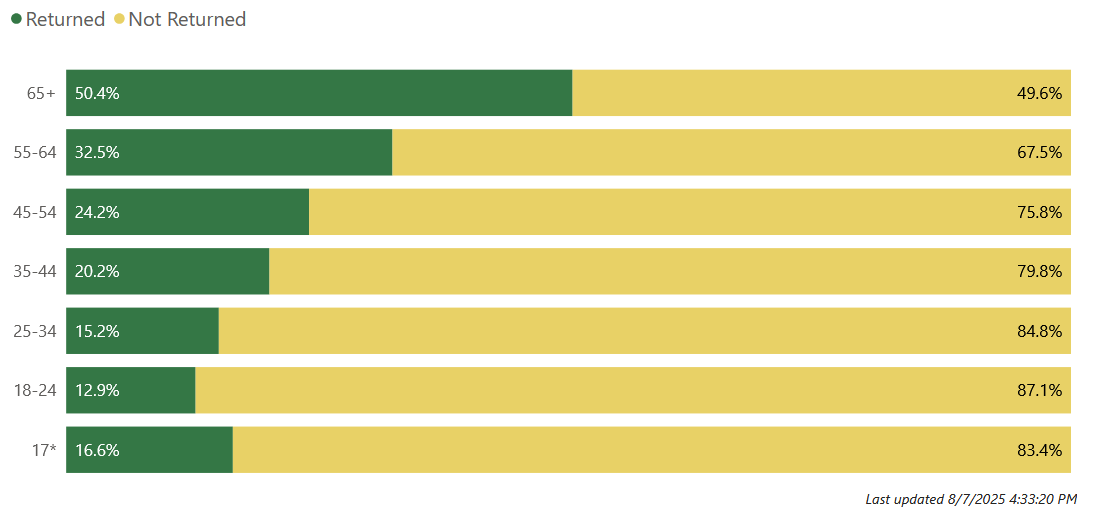 The politics of elected officials voting for change are a serious challenge. Older voters vote. In the 2024 Presidential Election, nearly all seniors voted, while only two-thirds of younger voters did. In the odd-year primary election, it is even more stark. In the election just concluded in 2025, only a tiny fraction of younger voters cast a ballot. [Note: this graph is on 8/7; it needs to be updated in a week with the final result.]