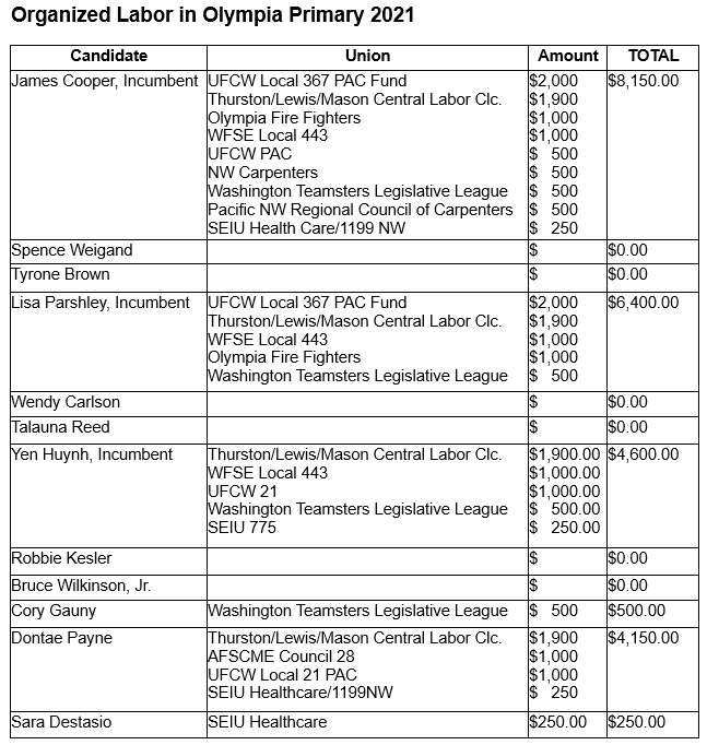 Cooper, on the other hand, raised $23,530, one-third of it from organized labor. The UFCW gave the most, followed by the Central Labor Council, Fire Fighters, State workers, Carpenters, Teamsters and SEIU. His other $1000 contributors were the Progress for Public Safety non-profit run by Jason Berman and Alex Christiansen. Brandy Helms also gave $1,000.