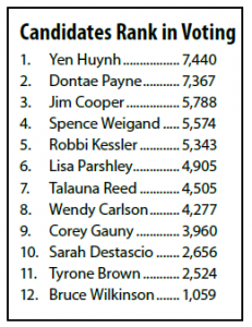 The Cooper, Weigand, Brown race. Incumbent Jim Cooper, on the Council since 2011, is the longest serving Council member. He has the endorsement of current Council members Gilman, Madrone, Parshley and Rollins. Spence Weigand is a long-time real estate agent for Virgil Adams Realty. (Although tenant organizer Tyrone Brown came in third, his underfunded campaign attracted a surprising 2,524 votes on an expenditure of $1,620.)