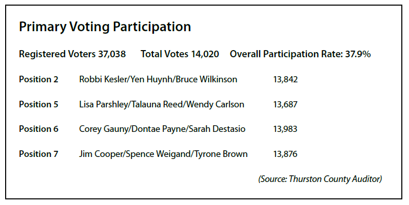 The City’s voters responded to these stories with a high turnout in the primary, casting 13,933 votes for a 37.6% turnout of the City’s 37,038 registered voters. The number of voters is well above the approximately 11,000 voters who participated in the 2019 primary. In addition, more than twenty of Olympia’s precincts had a higher participation rate—between 40% and 54.8%.